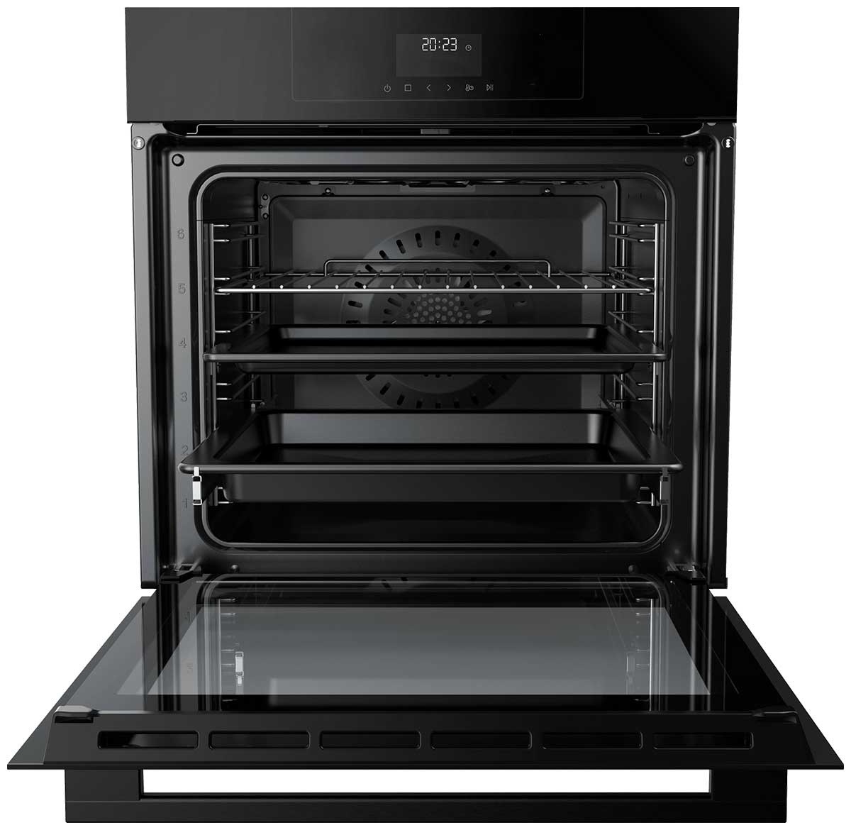 Контроль режимов, времени приготовления и температуры осуществляется на сенсорной панели с дисплеем. Плавное закрывание дверцы и телескопические направляющие гарантируют удобство в эксплуатации. Система очистки паром упрощает уход за внутренними стенками духового шкафа. В комплекте с Haier HOQ-F3AAN3GB поставляются глубокий противень, стандартный противень и решетка.
